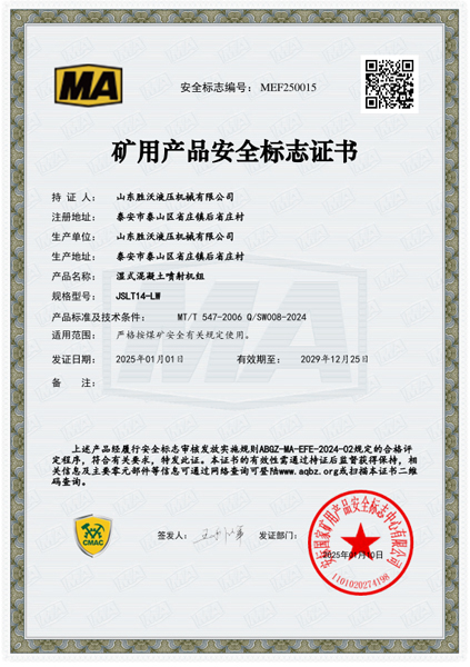 熱烈祝賀山東勝沃取得10~14立方挖鬥上料濕式混凝土噴射機組(zǔ)安標證書